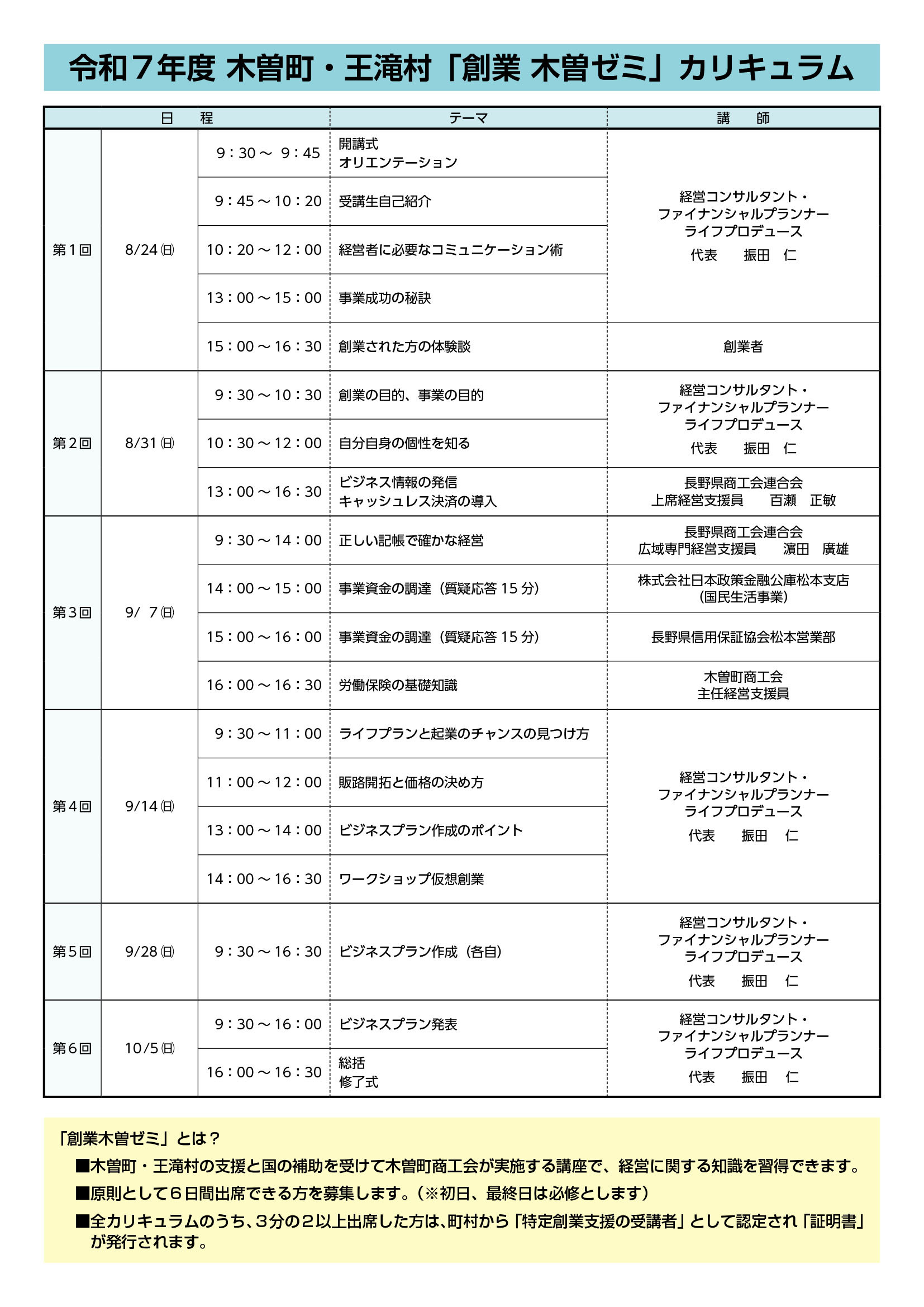木曽町・王滝村に新規創業を考えている方、創業して間もない方が対象で、経営に関する知識を習得できます。原則として6日間出席できる方を募集します。全カリュキラムのうち、3分の2以上出席した方は、町村から「特定創業支援の受講者」として認定され「証明書」が発行されます。