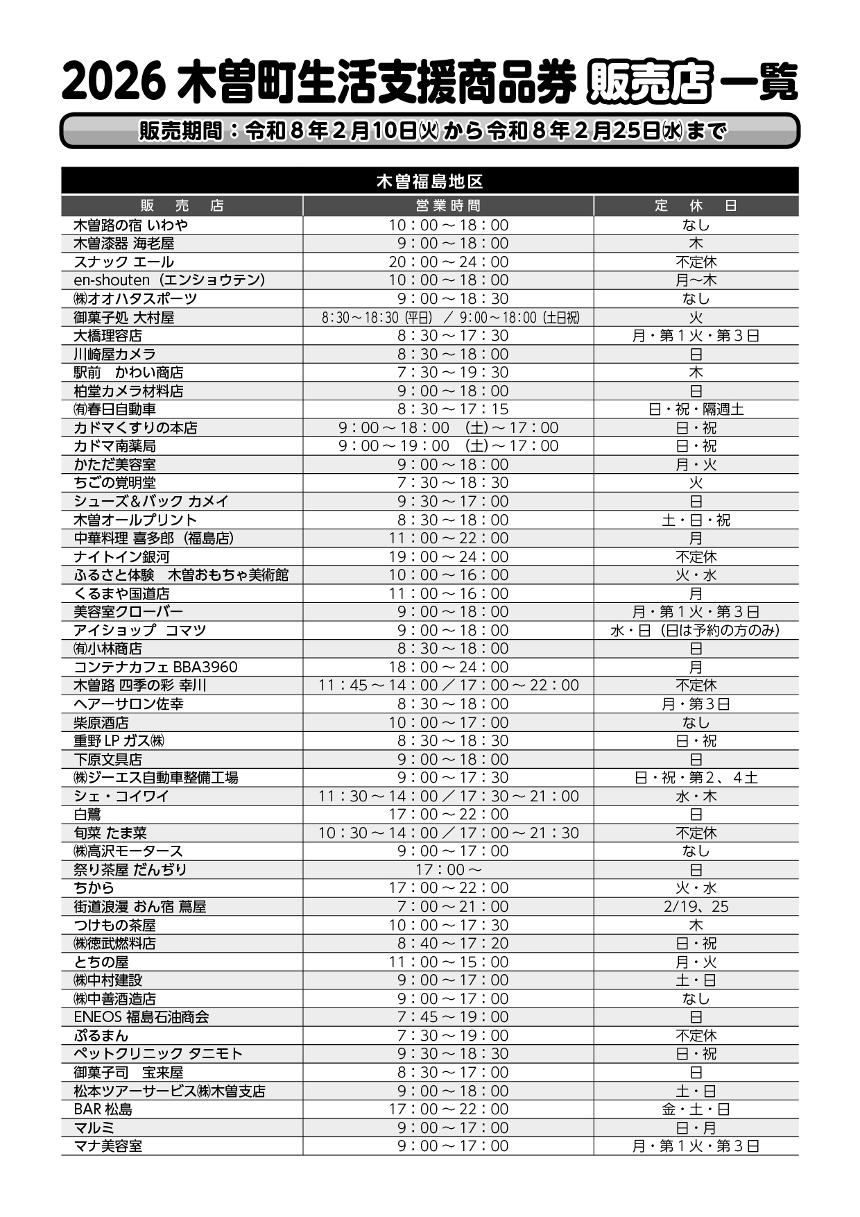 尚、木曽町商工会は、木曽町・王滝村の2町村を担当しています。