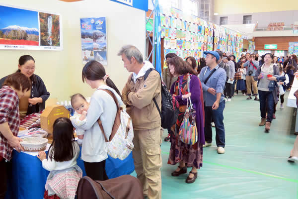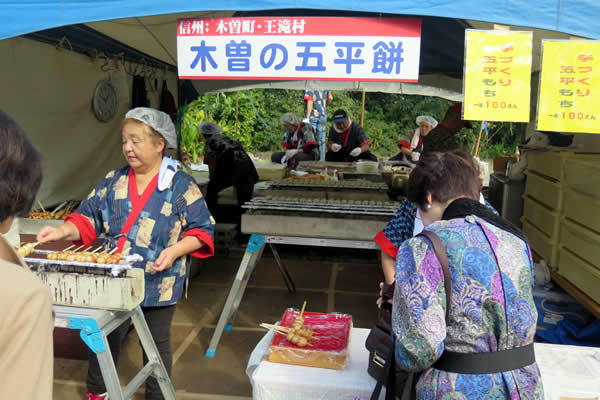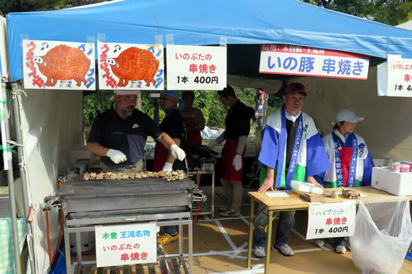 秋の好天にも恵まれて、地域内の各種特産品の販売のほか、開田高原のそば、日義の五平餅、王滝からは「イノ豚の串焼き」などが出店し、地域PRを実施。観光PRブースでは、地域の情報提供や観光PRが行われました。